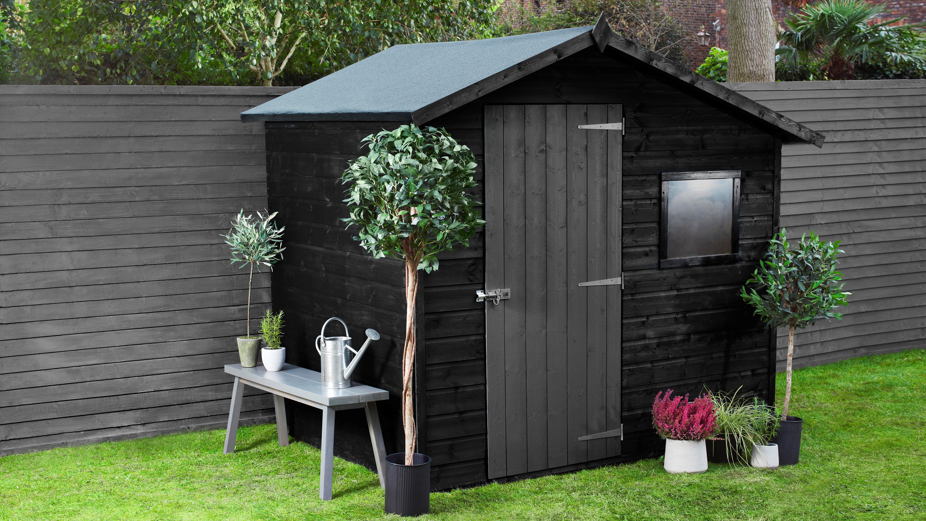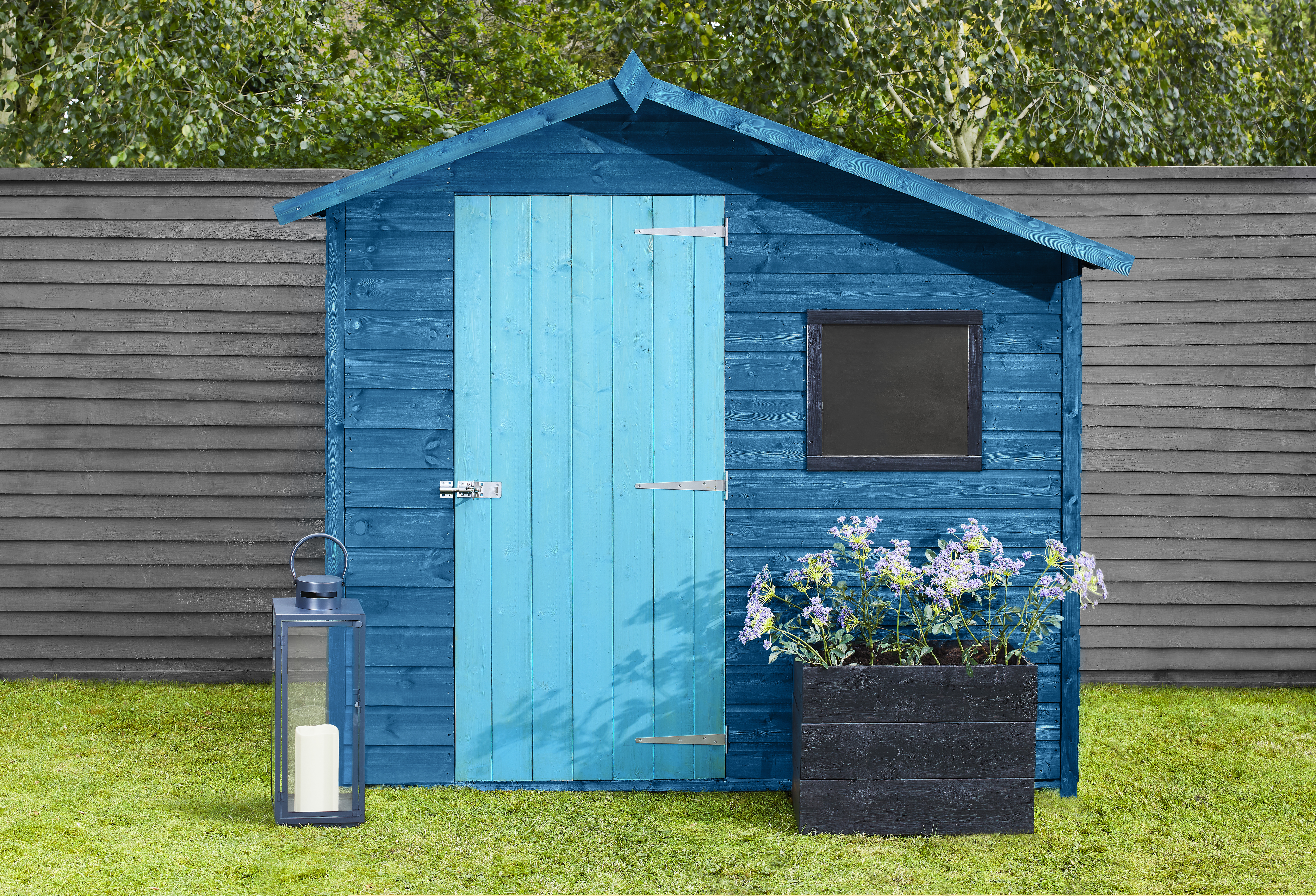 Top tip: If you want to keep your black shed centre stage, add depth and interest to it by painting your door in a contrasting colour. Here we’ve used Fence Life Plus in Charcoal Grey.